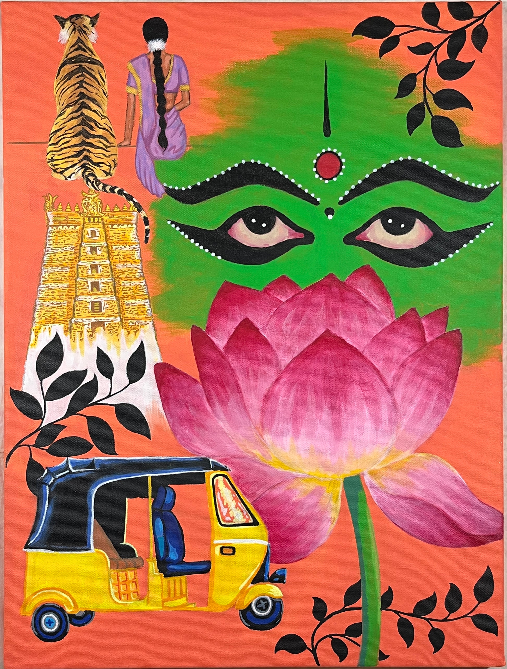 Created with the intent to bring light to the lesser-known and deeply rooted elements of South India, this artwork weaves together powerful cultural symbols: the expressive eyes inspired by Kathakali, the sacred lotus in bloom, the golden temple gopuram, the iconic auto rickshaw, and the quiet strength of a woman seated beside a tiger. Each element represents a different dimension of heritage: spirituality, resilience, femininity, folklore, and everyday life.