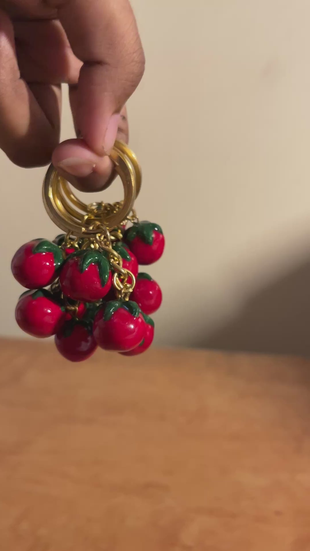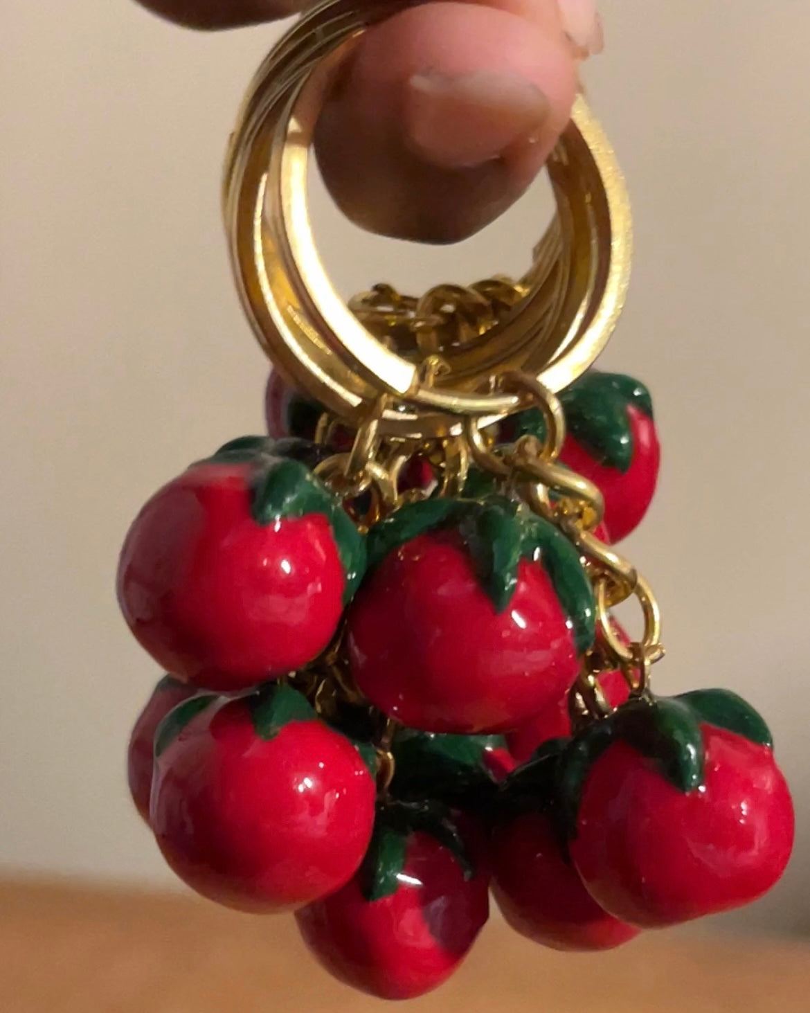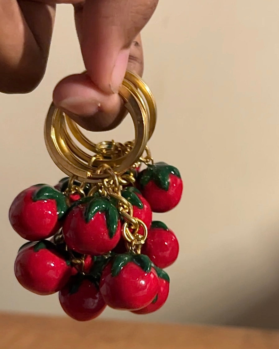 This handmade tomato keychain is carefully sculpted from air-dry clay and finished with a high-gloss protective coating for that fresh, juicy shine. Featuring tiny bright red tomatoes with vibrant green tops, this food-inspired bag charm adds a playful pop of colour to your everyday essentials😋